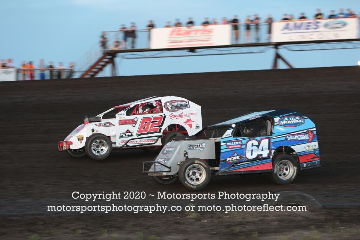 Up next was the 20-lap IMCA Modified feature. This one saw Gatlin Leytham and Jimmy Gustin lead the field to green, but by corner one, sixth place starter Kyle Brown was already leading the race. From there on Brown showed total domination in securing his first win of the 2020 season. Joel Rust chased Brown across the finish line in second place, Tim Ward came from ninth starting spot to finish third, Russ Dickerson was scored in fourth, and rookie to the class, Jake McBirnie, was fifth.