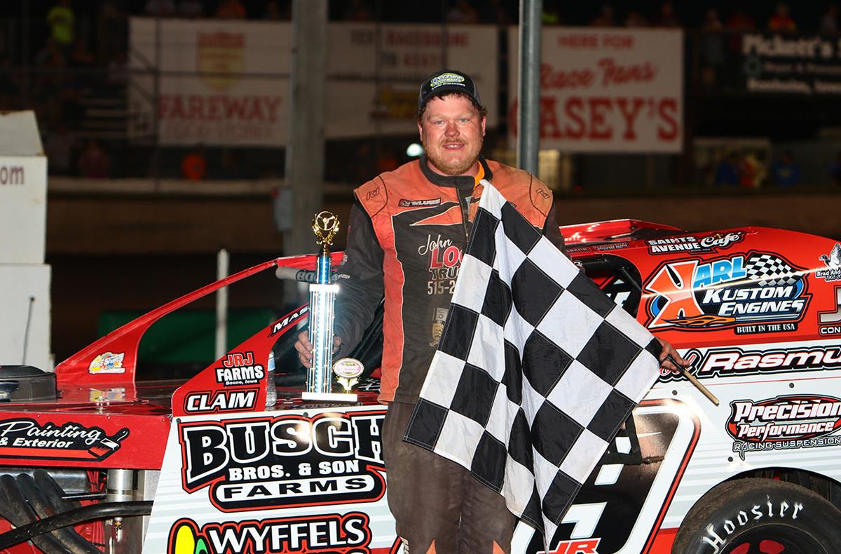 The IMCA Modifieds ran their 20-lap feature event next and it saw polesitter Jacob Murray shoot off to the lead. Jake McBirnie was quickly up to challenge the leader and began pestering Murray. Lap thirteen was Murray's bad luck. A slight bobble was all McBirnie needed and he seized the moment flying into the lead. He would then keep it to the flying checkers and the win. Murray held on to take the runner up spot, Doug Smith trailed a distant third, Cody Laney took fourth place from starting twelfth, and Jeremy Mills started thirteenth, and took fifth. This made McBirnie's second win at the track this year.