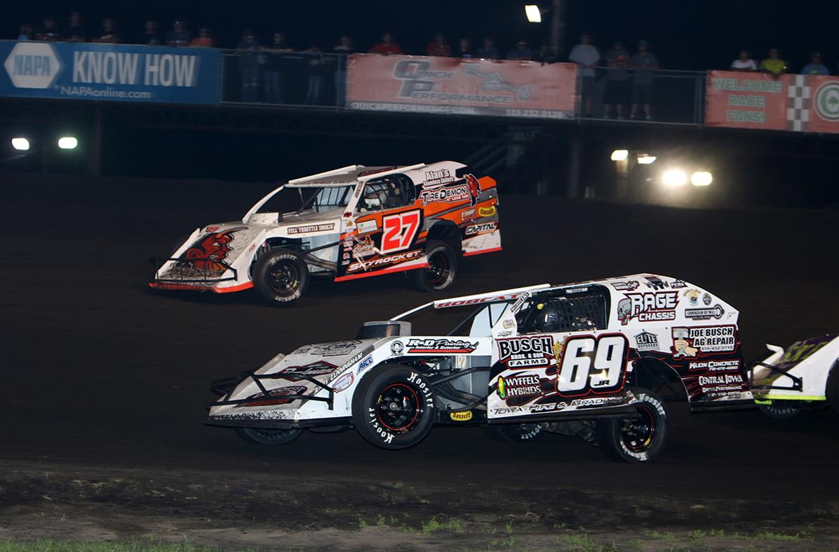 Jimmy Johnson, Cherokee, Iowa jumped to the immediate lead from his pole starter position when the race went green. Seth Butler was quickly into second and chasing the leader, and Eric Knutson throwing his hat into the ring to run third when the only caution of the race flew on lap three. When the race restarted, Knutson made his way into second and began pestering the leader. It took until lap eight before his persistence paid off, and Knutson took over the top spot. Knutson held on then the rest of the way to take the win, also his first of the year, with Johnson finishing a close second. Seth Butler took third place, fourth went to fourteenth place starter John Watson, and Solomon Bennett took fifth after starting tenth.