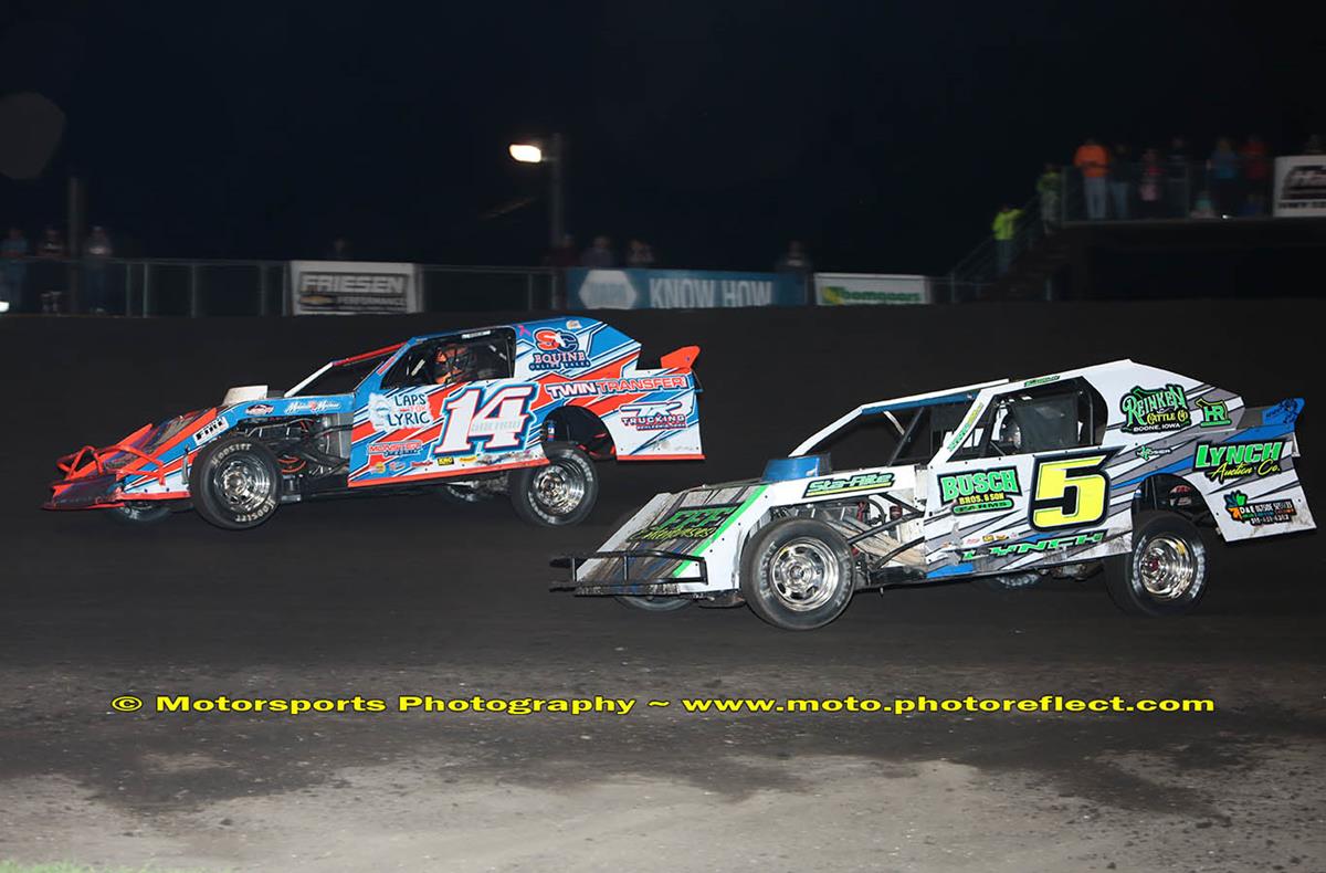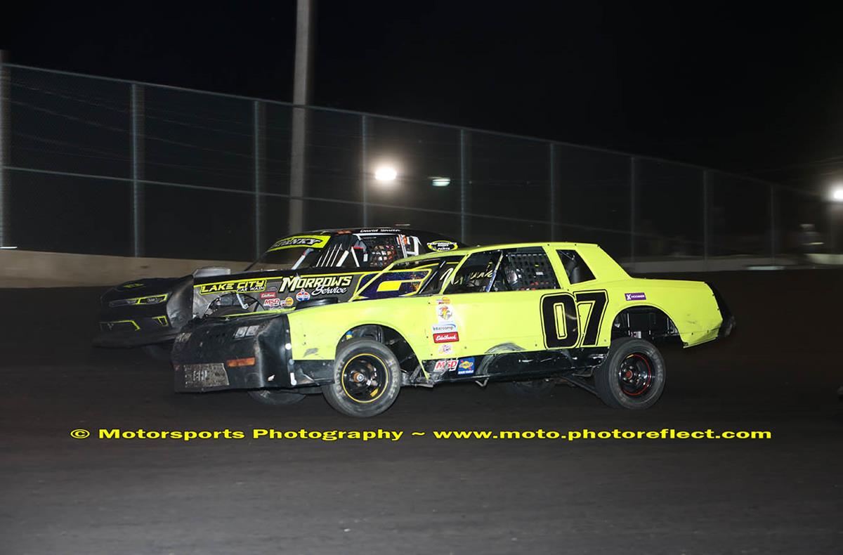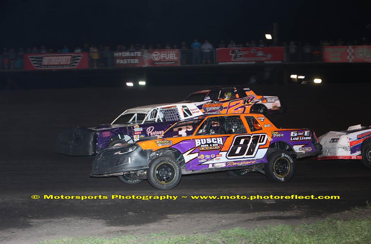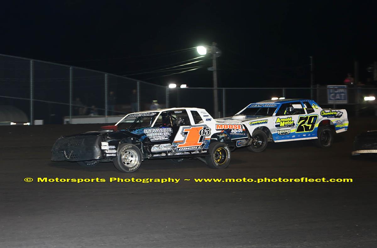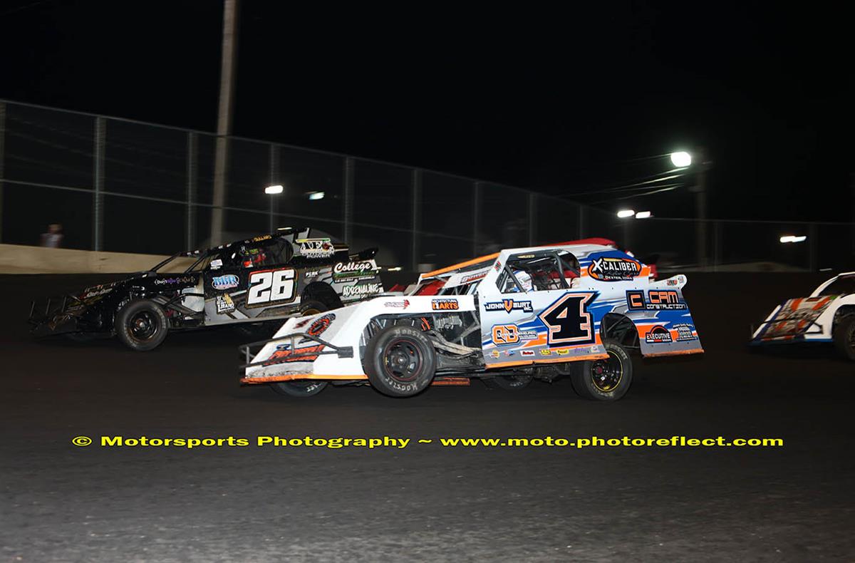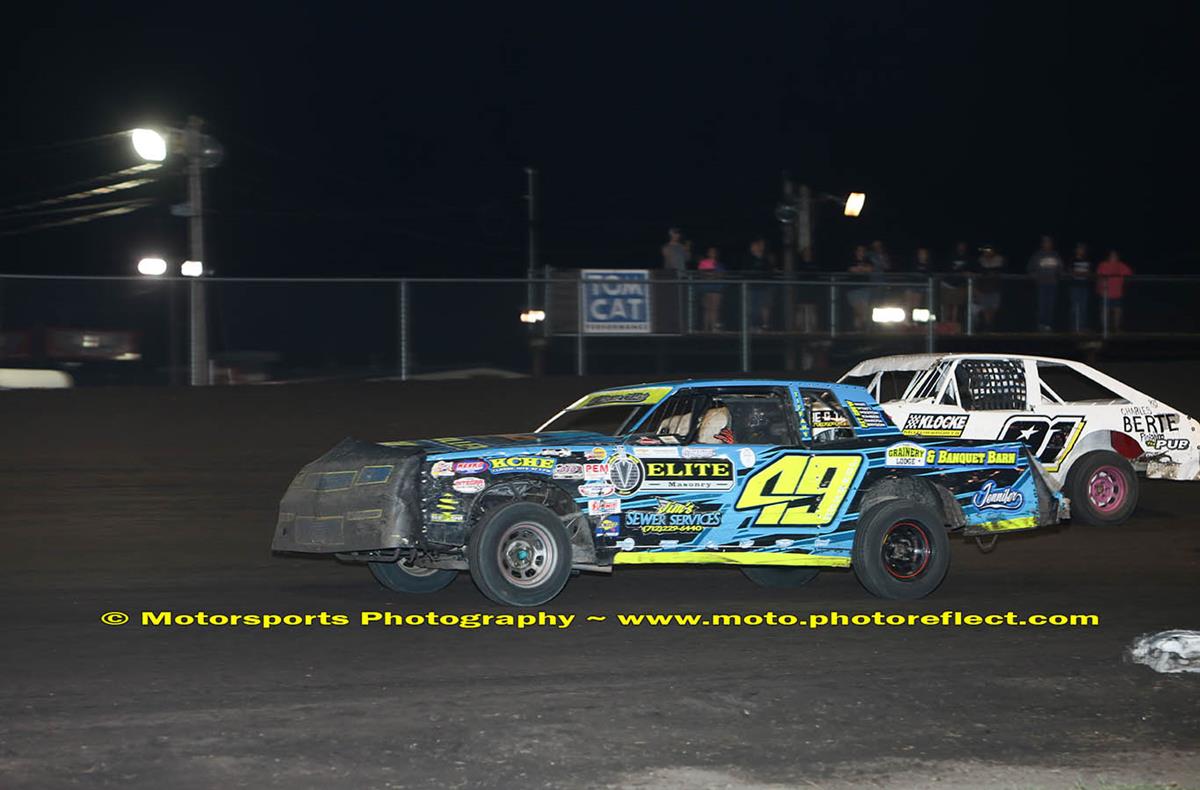 Jeff Mueller appeared destined to go to Victory Lane after taking the lead on lap four as he hugged the corners, his preferred line. Nick Roberts had worked his way from starting seventeenth to catch the leader at lap fourteen and was weighing his strategy on how to get around the leader. After taking the white flag, Roberts somehow nosed under Mueller in corner two, took the lead on the backstretch and made it to the checkers first for the win. Devin Smith and Donovan Smith were also able to get around Mueller in the closing moments as they went second and third respectively, with Mueller, a not too happy fourth, and Bob Daniels taking fifth. Nick Roberts marked his first win at the track this year in the race that went flag to flag.