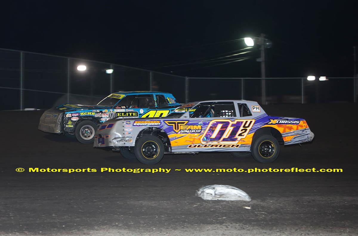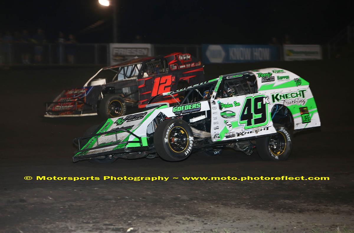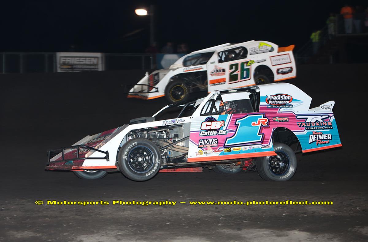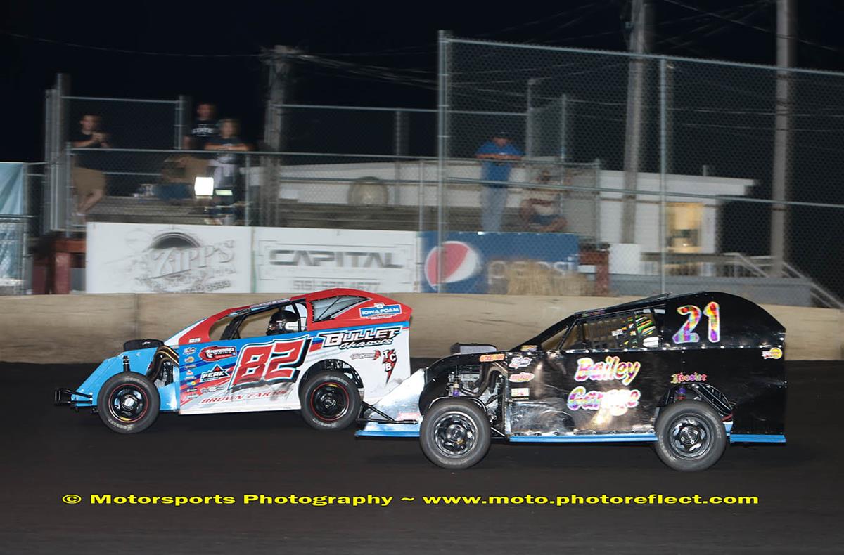 After the initial start was yellow flagged, it was Jimmy Johnson, Cherokee, Iowa hot shoe taking advantage of his pole starting spot as he flew off into the lead. Meanwhile, it was young Mike Smith ripping the lip on the topside after starting eighth, and by lap four he had the lead. Smith led easily for the next four laps, until a flat tire would put him out of the game. Two laps later, it was second generation racer and tenth place starter Dayton Ullrich, Kiron, Iowa taking over the lead from Johnson. Ullrich would then keep that lead the rest of the contest and take home his first ever win at the track. Johnson finished in second, fifteenth place starter Joe Doran finished third, Solomon Bennett was fourth, and Josh VanCannon was fifth. The race continued caution free after the initial yellow before lap one was scored.